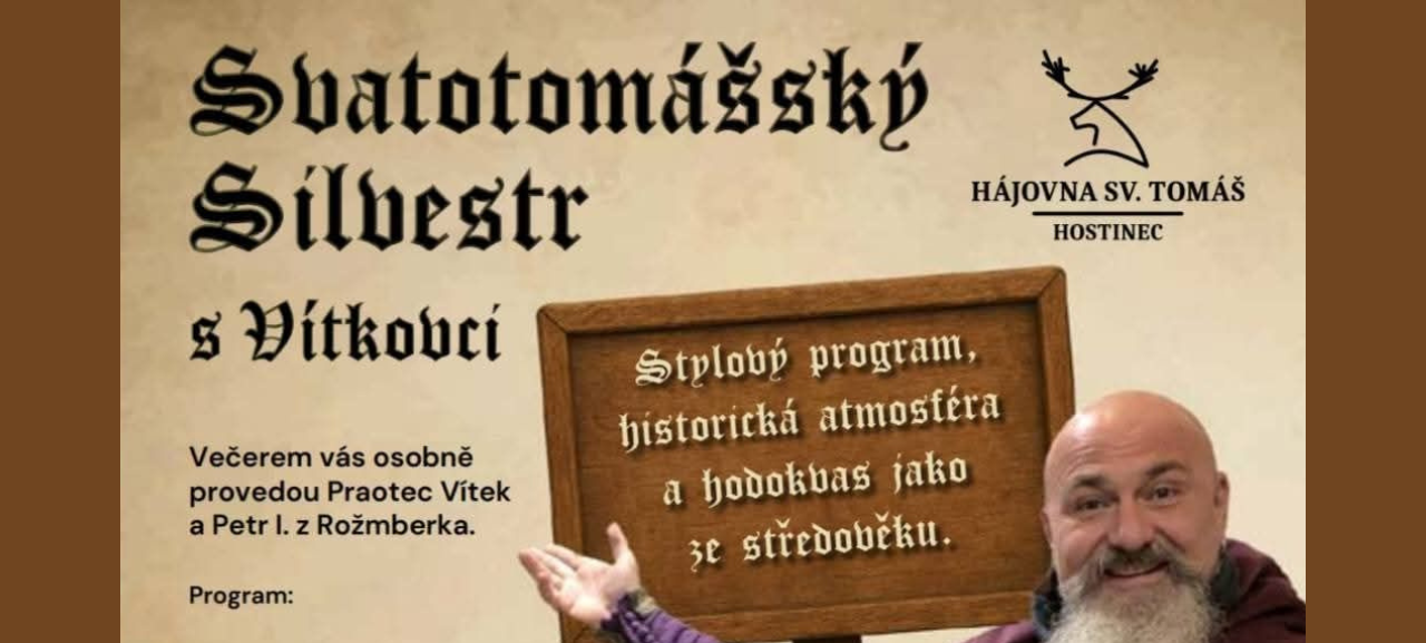 Der Gasthof Hájovna St. Thomas in Vítkův Hrádek verwandelt sich am Silvesterabend in eine mittelalterliche Feststätte. Durch den Abend führen persönlich Urvater Vítek und Peter I. von Rosenberg, die für eine authentische und unterhaltsame Atmosphäre sorgen.