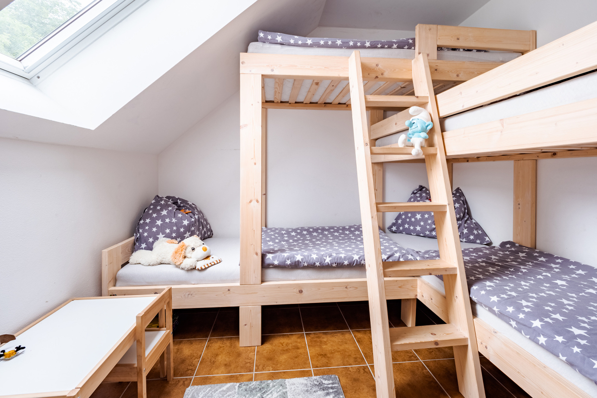 Das Interieur des Apartments ist modern und in hellen Farben gestaltet, mit Liebe zum Detail und Fokus auf Komfort und Funktionalität. Die Raumaufteilung umfasst zwei separate Schlafzimmer, ein Kinderzimmer mit zwei Etagenbetten, ein geräumiges Wohnzimmer mit Essbereich und eine voll ausgestattete Küchenzeile.
