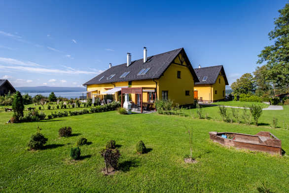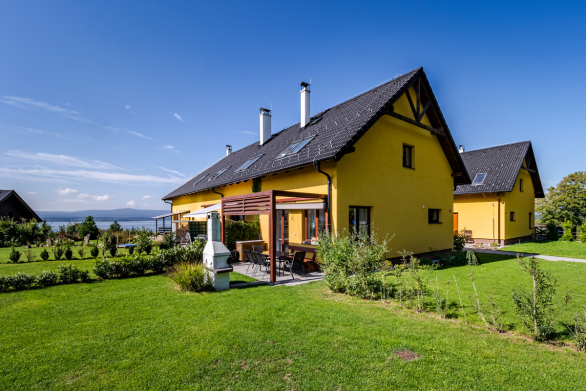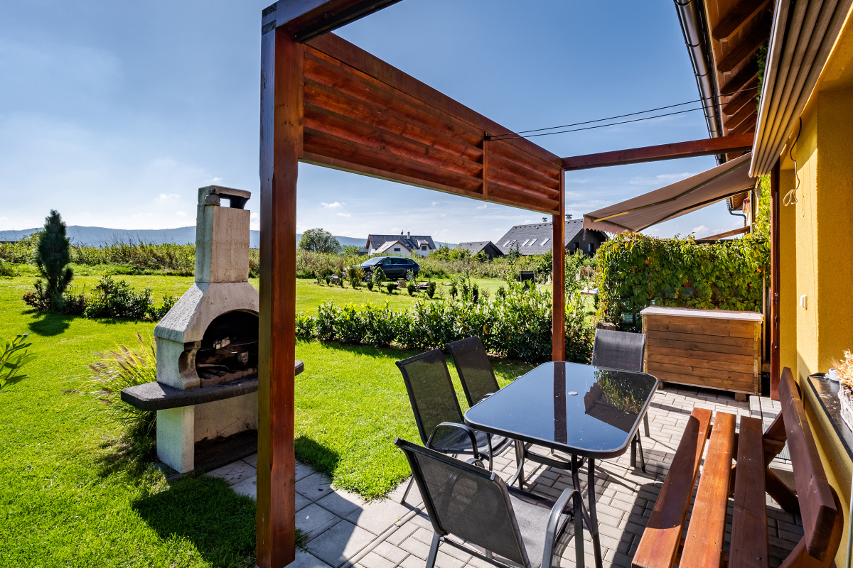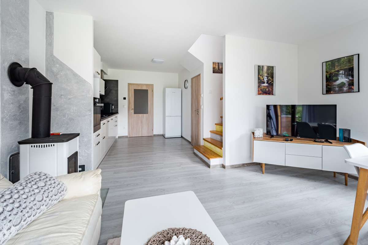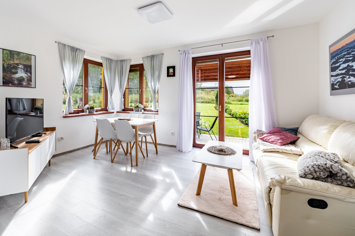 Vom Wohnzimmer aus gelangen Sie auf die private Terrasse mit Gartensitzgruppe – ein herrlicher Platz für ein sonniges Frühstück oder entspannte Abende. Der Garten bietet einen schönen Blick auf den Lipno-Stausee und das umliegende Grün.