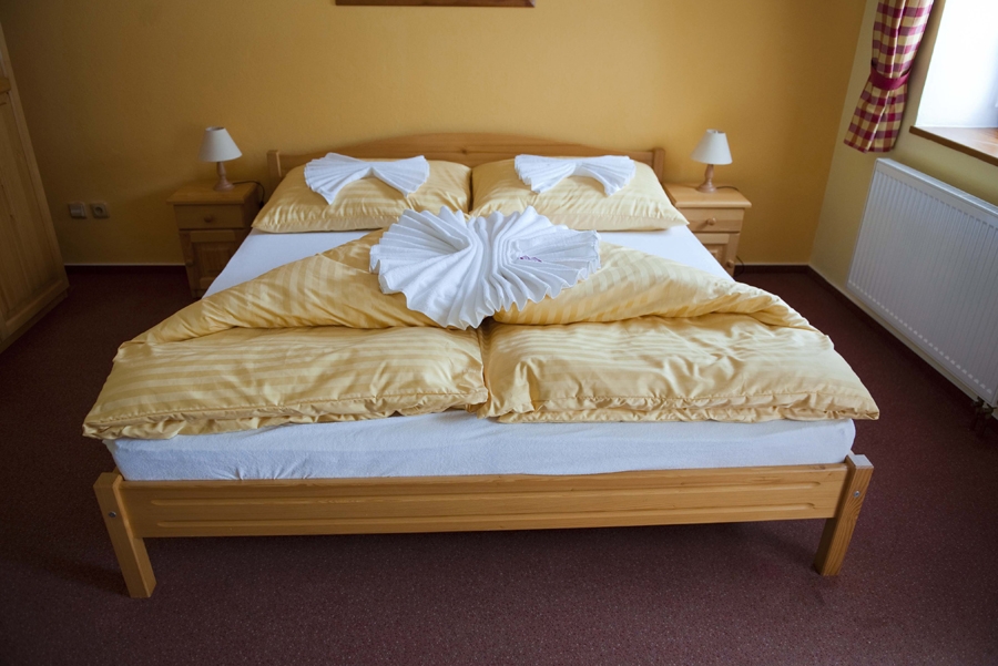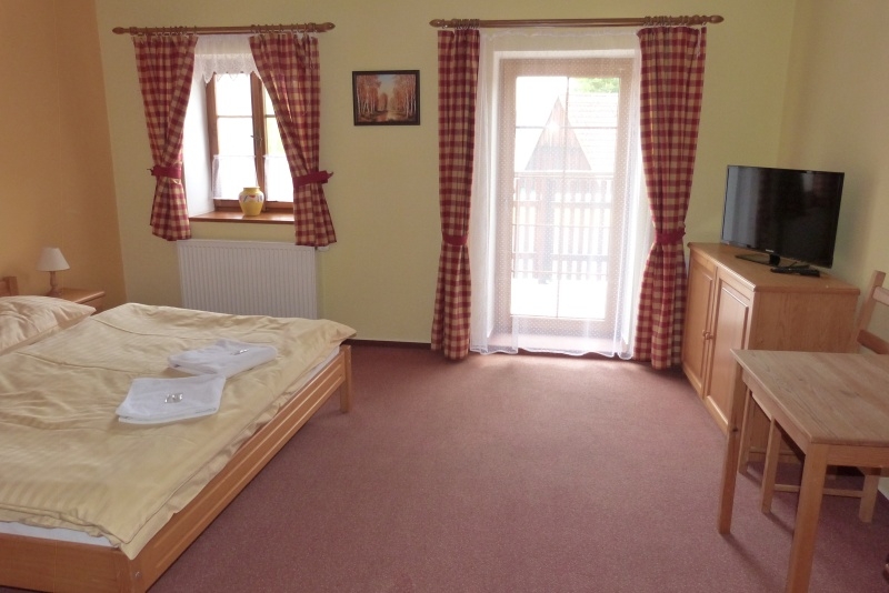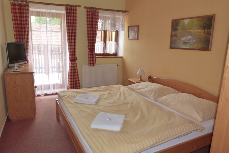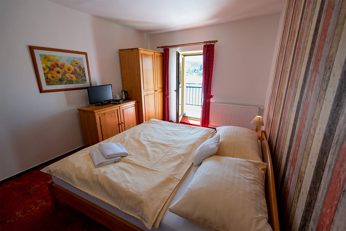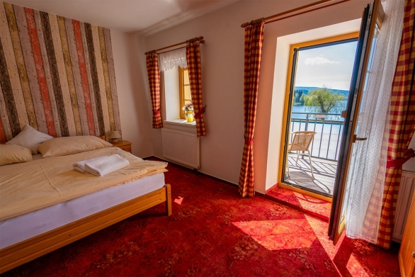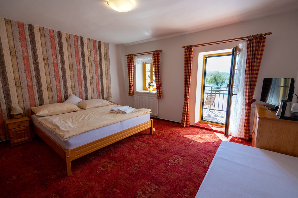 Jedes Zimmer ist komfortabel ausgestattet mit eigenem Bad (WC, Dusche), Fernseher, einem kleinen Flur und einer Sitzecke. Genießen Sie je nach Zimmerlage einen herrlichen Blick auf den Lipno-See oder auf den gegenüberliegenden Hügel „Marta“ mit seiner Skipiste. Vier der Doppelzimmer verfügen über einen Balkon. Kostenfreie Parkplätze stehen direkt an der Pension für Sie bereit.