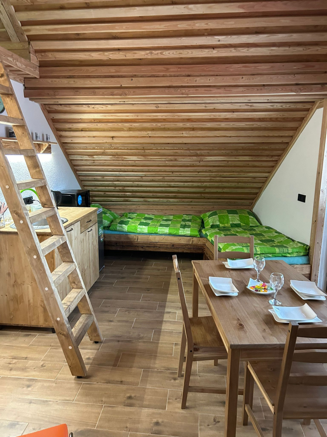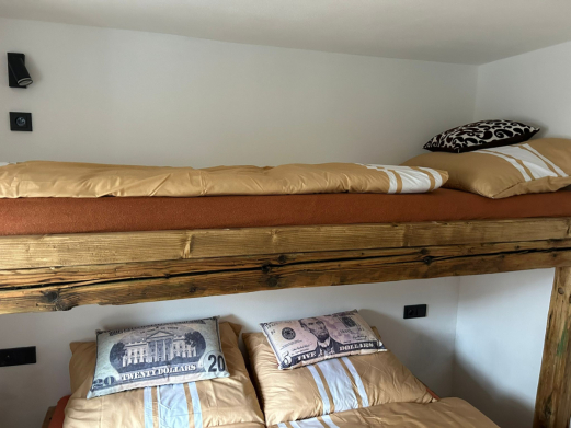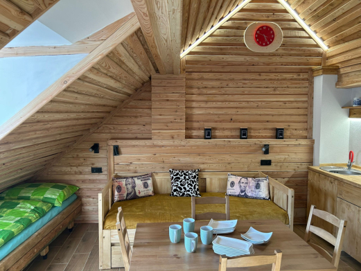 Großzügiges Maisonette-Apartment für bis zu acht Personen. Es vereint Stil, Komfort und die einzigartige Atmosphäre von Holz. Im oberen Stock befinden sich weitere Schlafplätze – ideal für Kinder oder Freunde, die etwas Privatsphäre wünschen.