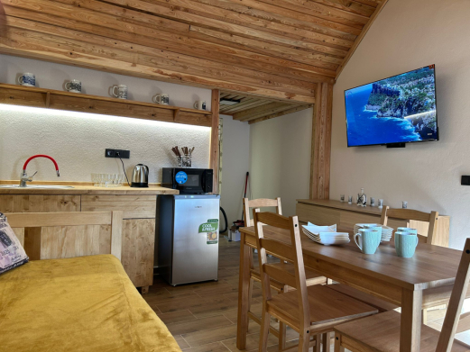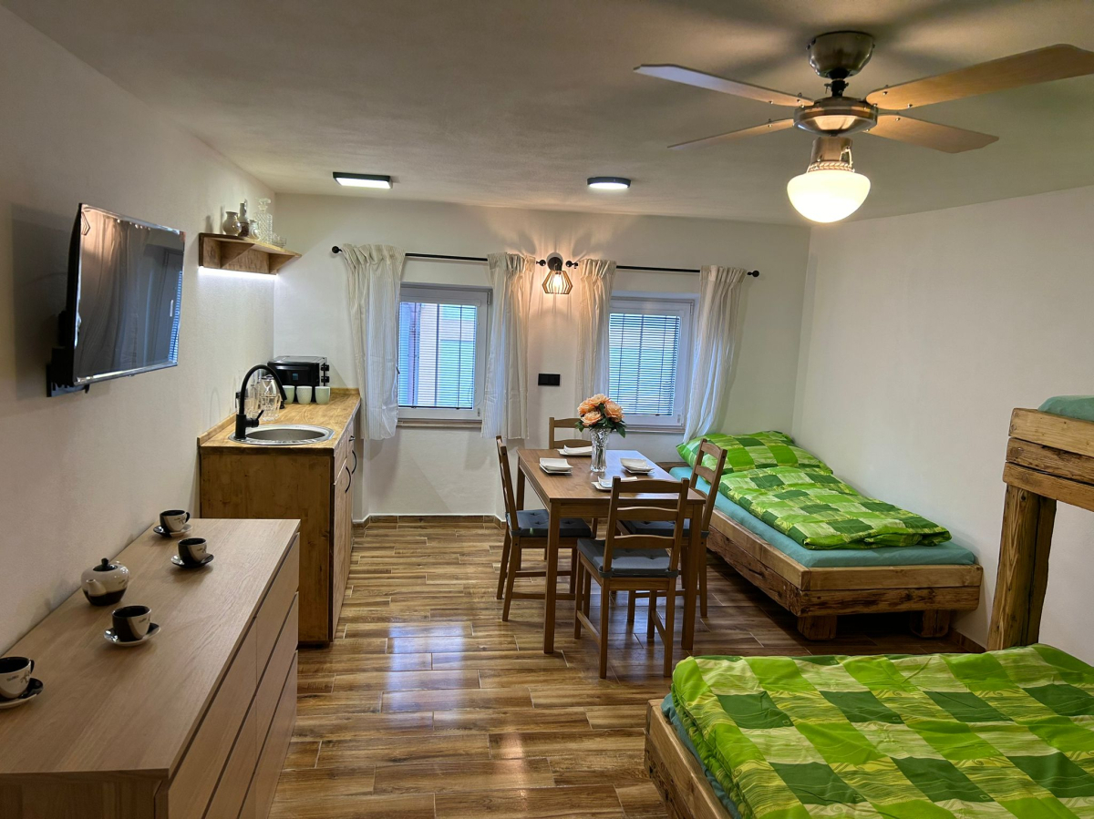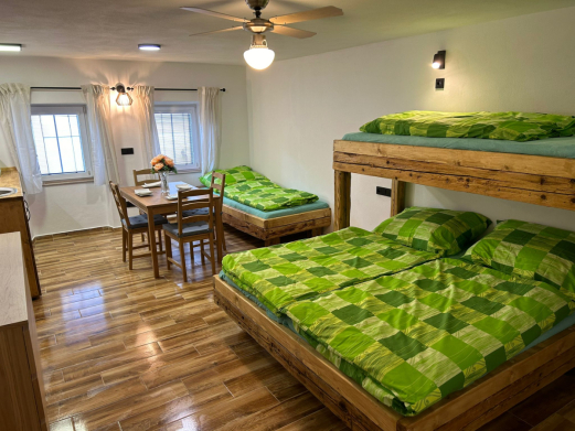 Die Pension besteht aus fünf großzügigen Apartments für 5–8 Personen, die durch ihren rustikalen Holzstil, ihre hochwertige Ausstattung und ihre behagliche Atmosphäre bestechen. Jedes Apartment verfügt über eine eigene Küche, ein Bad und einen Blick ins Grüne, der das Gefühl von Ruhe und Privatsphäre noch verstärkt.